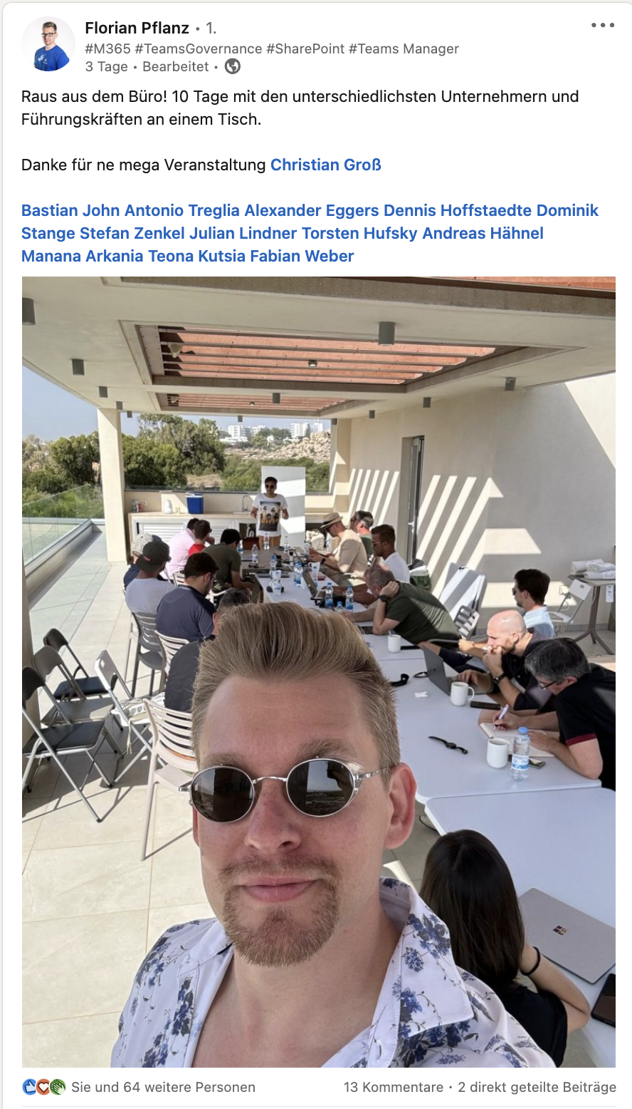 Christian Groß ist langjähriger M365 Unternehmer der ersten Stunde. Während der letzten 5 Jahre entwickelte er mit seinem Team 9 Teams Apps mit über 20.000 Installationen weltweit, baute ein eigenes Dienstleistungsunternehmen auf und gründete zusätzlich noch die größte deutschsprachige M365 Konferenz, welche viermal im Jahr stattfindet. Nun ruft er die jährlich stattfindende M365 Unternehmertage ins Leben.